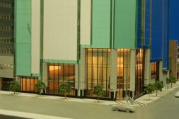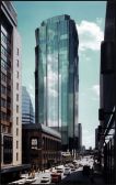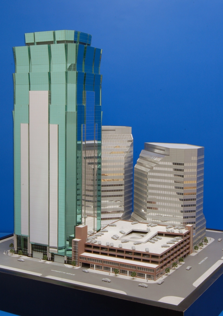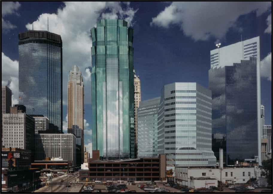 Model of AT&T Tower, Kinnard Financial Centre and parking Ramp are superimposed into a photo of the Minneapolis skyline. The model was built using reflective tinted acrylic and photographed outside with cloud reflections.
